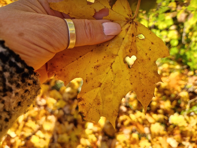 Men mitt i allt detta – när tvivlet, tomrummet knackade på och inspirationen verkade ha smugit ut bakvägen – så landade jag i något viktigt under min soliga skogspromenad igår. Ett löv släppte taget om sin gren och kilade sig beslutsamt fast mellan mitt vänstra öga och mina glasögon. Jag lyfte upp det gyllene lövet och log i hela kroppen när jag såg det vackra hjärtat mitt i allt det gula.